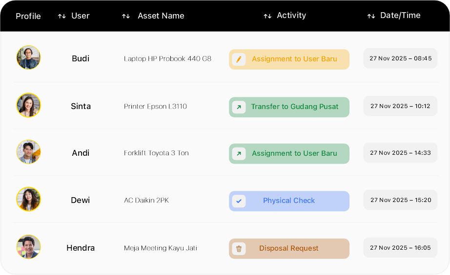 Riwayat aktivitas dan perubahan aset tercatat otomatis sebagai audit trail
